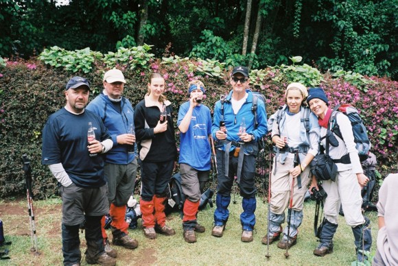 Coke celebration on reaching Mweka Gate: Mark, Greg, Kimberly, Judy, René, Alix, Clarice