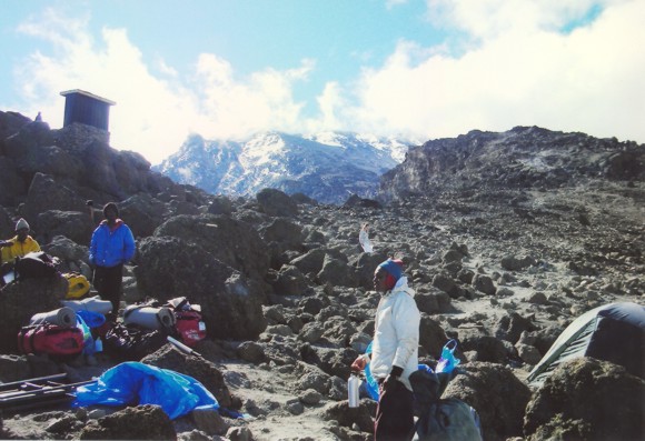 Packed and ready to leave Barafu: Uhuru Peak in the clouds; notorious toilet structure top left