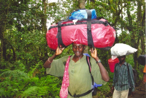 Porters in the Rain Forest - ascending the mountain: René's red duffle bag