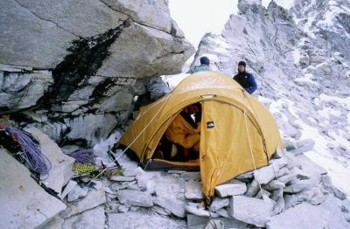 Ama Dablam Camp I: Tents are set up on a rocky outcrop